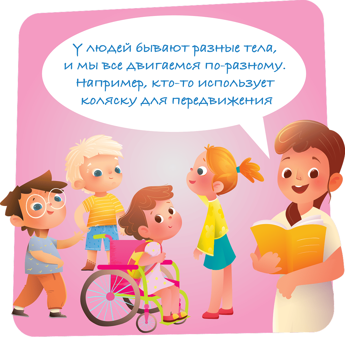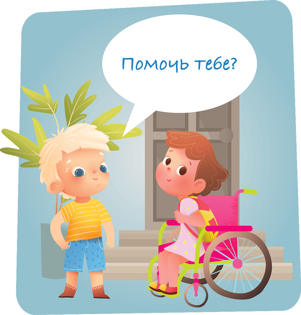 Для некоторых детей инвалидная коляска это единственный способ передвигаться. В коляске — такой же ребёнок, как и ты, он тоже хочет играть и познавать мир. Если хочешь подружиться — поговори с человеком. Не нужно трогать коляску без спроса. Прежде, чем помогать, спроси, хочет ли человек, чтобы ему помогли и как именно нужно помочь.