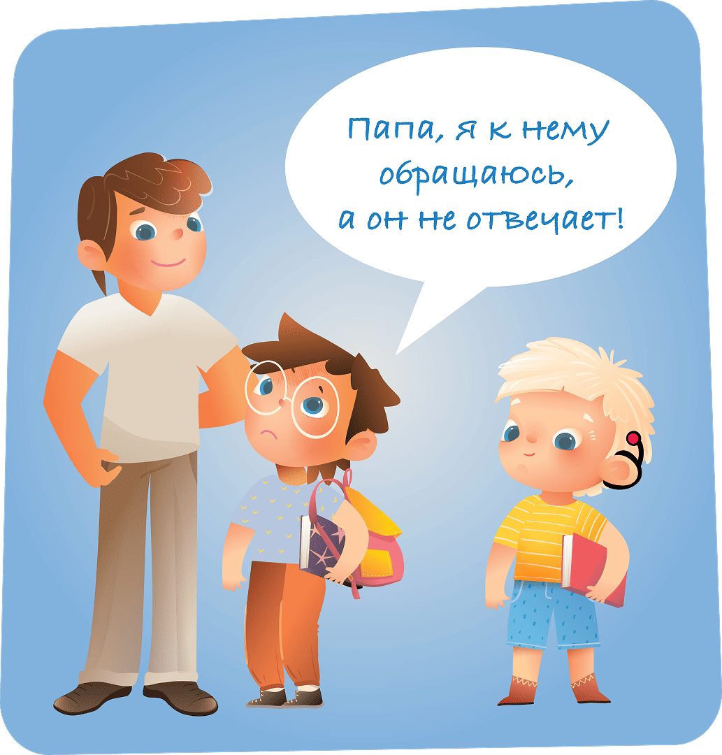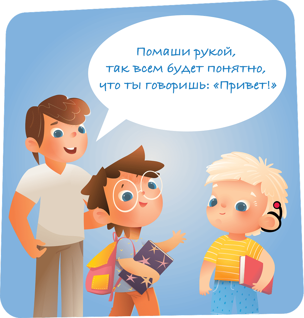 Некоторые люди слышат иначе, могут слышать не очень хорошо или вовсе не слышать. Они могут пользоваться специальными слуховыми аппаратами, многие используют для общения Русский жестовый язык. Хочешь познакомиться или поиграть? Привлеки внимание собеседника, установив зрительный контакт, помахав ему или слегка прикоснувшись своей рукой к его ладони или плечу. Используй жесты и мимику, четко произноси слова. Важную информацию запиши на листке или отправь в сообщении.